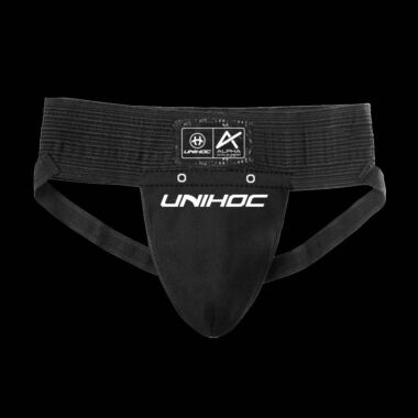 unihoc Tiefschutz für Junioren. Suspensorium aus Kunststoff, ist vom elastischen Gurt entfernbar. Schwarz und mit unihoc Logo vorne. Waschbar in der Maschine, mit oder ohne Suspensorium.